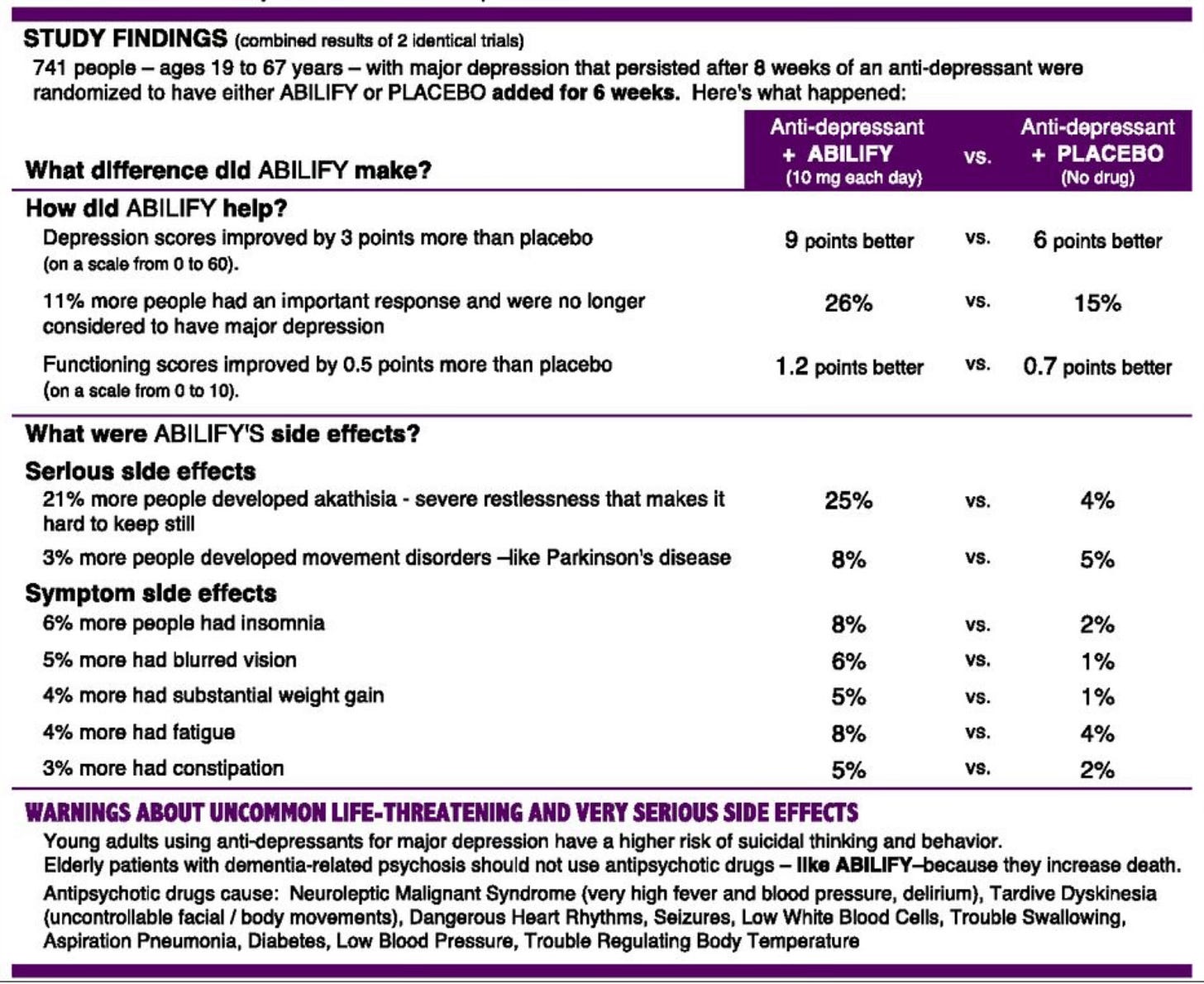 Past work by other researchers is worth noting. For years, Woloshin and Schwartz promoted drug fact boxes to the FDA, to journalists and to the general public. Here’s one example, depicting the trade-offs involved in the Abilify (aripiprazole) drug for depression.