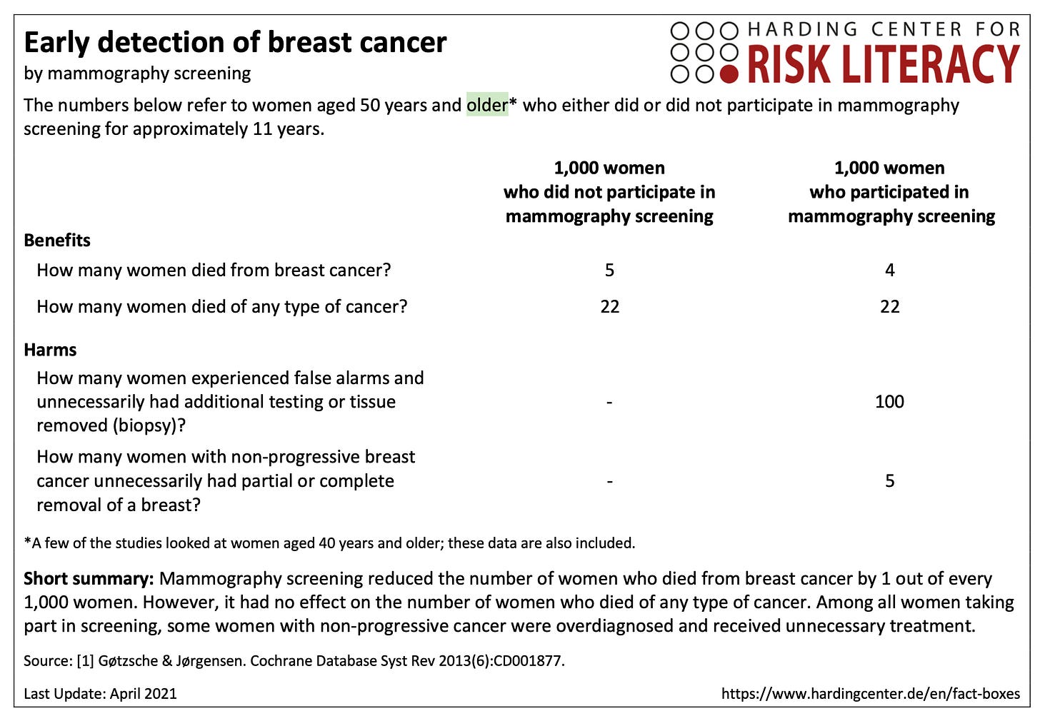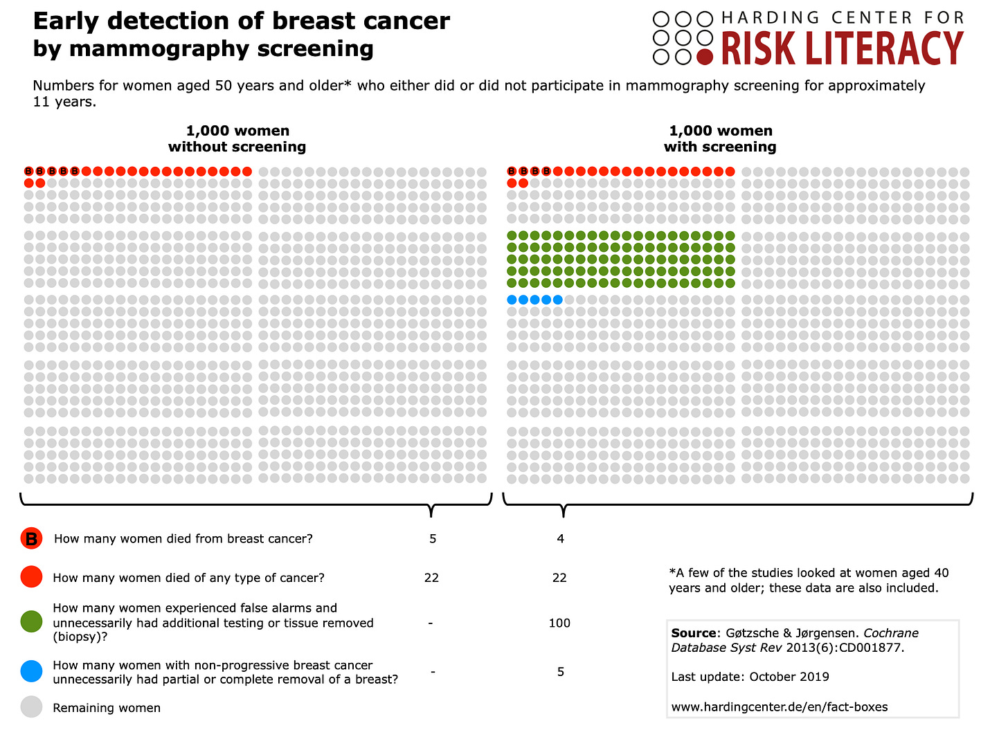 Here are two mammography screening examples from the Harding Center for Risk Literacy at the Max Planck Institute in Berlin.