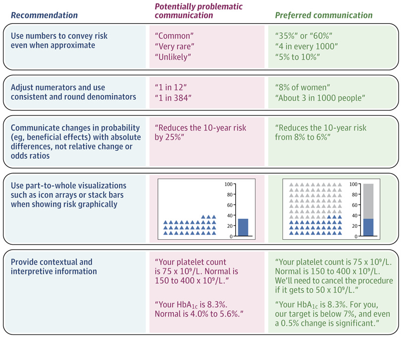 When communicating health numbers to patients, clinicians can improve patient understanding by presenting information using numbers rather than providing verbal probability terms such as rare, common, or unlikely; using consistent denominators; discussing absolute rather than relative risks *; and providing context for unfamiliar types of data.