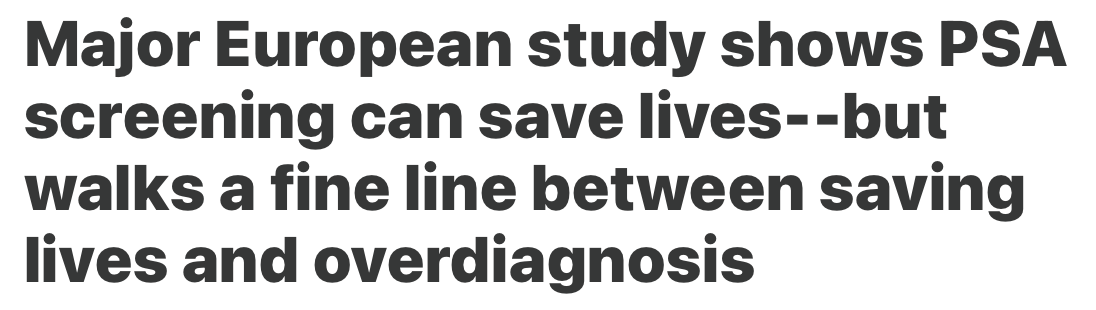 In short, he views this as “a minimal absolute risk reduction in prostate cancer deaths (0.2%), no difference in overall mortality, and we know that there are potential complications from biopsies and surgeries.”